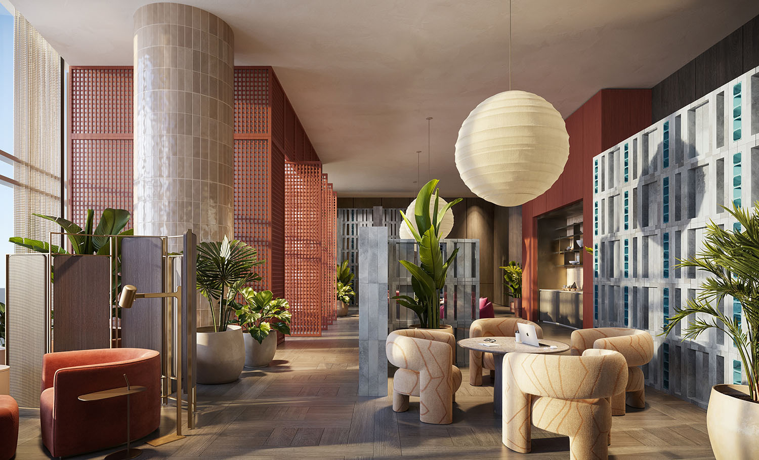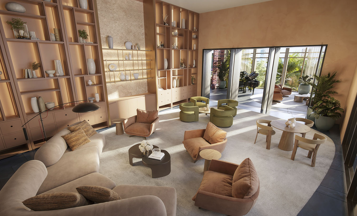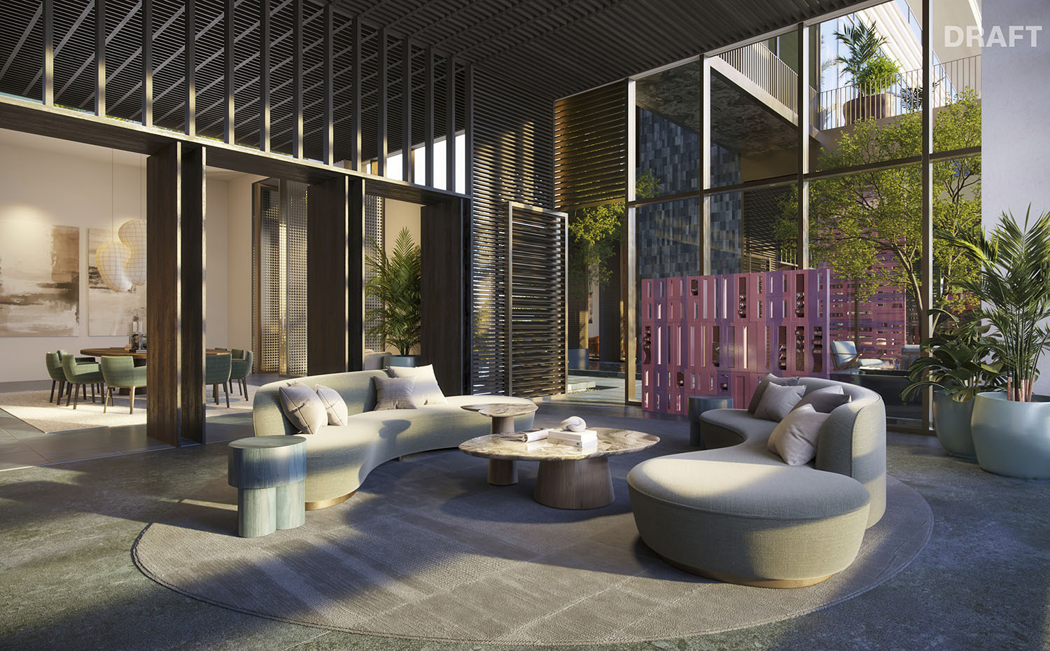 - Level 5 business lounge and coworking with conference rooms, podcast studio, art gallery, residents’ lounge, and bar.