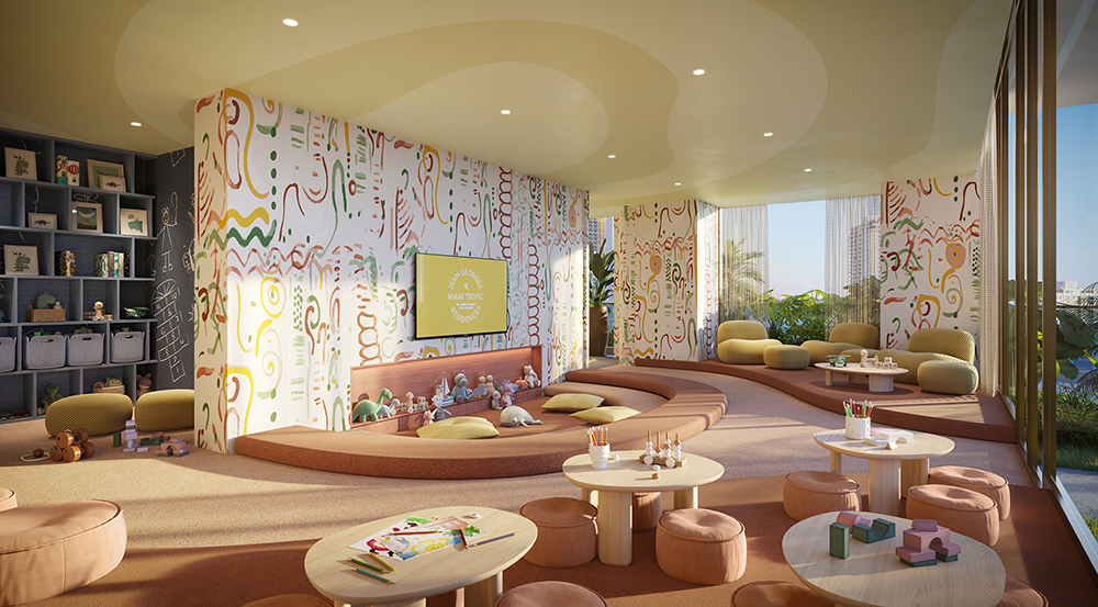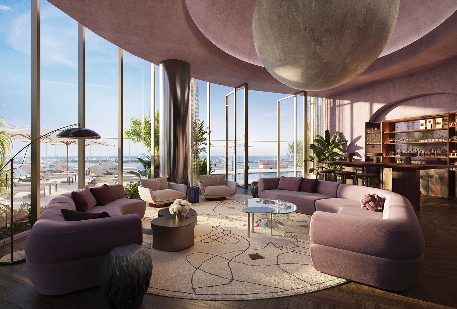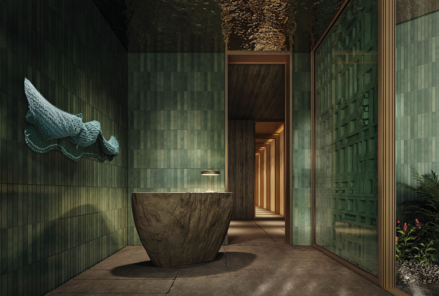 - Lobby and amenity levels by Yabu Pushelberg, immersed in CLAD-designed tropical landscaping and sculpture gardens.