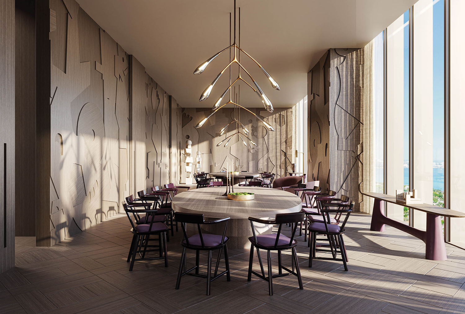 - Rooftop skydeck on level 49 with panoramic pool, sunset lounge and sky bar, archive library, and private dining room with catering pantry.