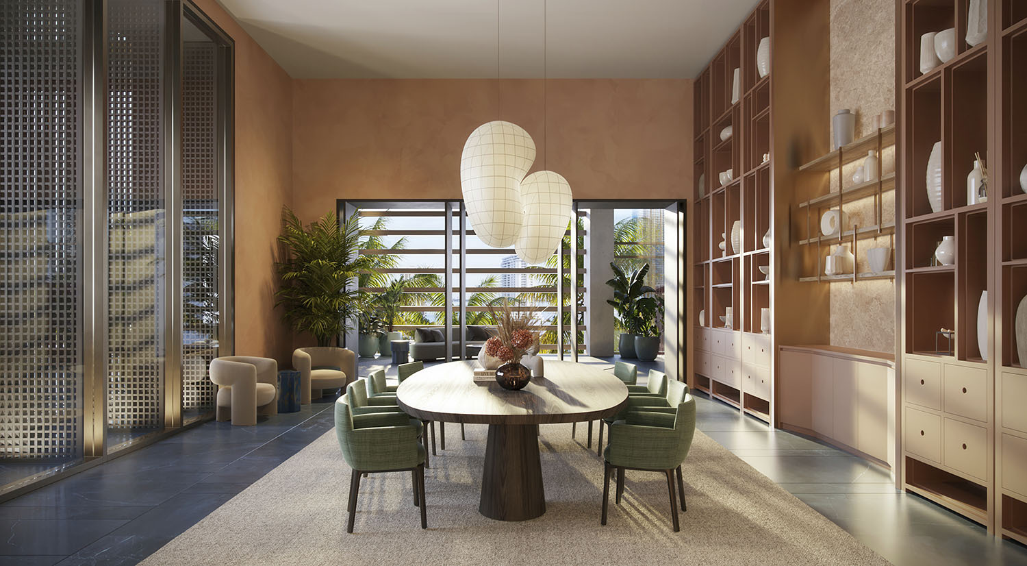 The building comprises 329 residences with private and semi-private elevator vestibules, 10- to 11-foot ceiling heights, and floor-to-ceiling windows that draw the sky directly into the living space. Generous balconies with glass railings create a continuous indoor–outdoor experience, while select corner residences enjoy immersive 180-degree vistas. Residence kitchens are inspired and vetted by two Michelin-starred chef Jean-Georges, featuring Gaggenau appliance packages, deep functional islands, and two distinct finish schemes—Dawn and Dusk—that balance bright coastal tones with richer, moodier palettes.